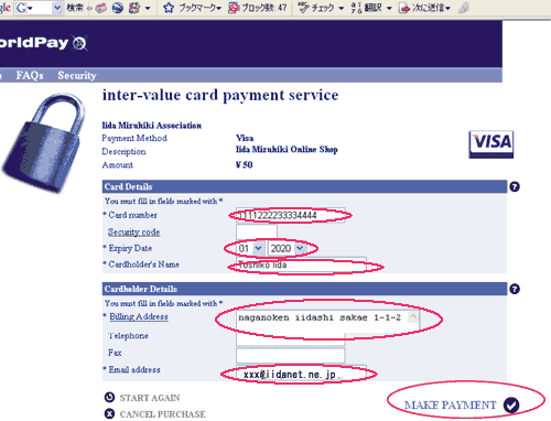他の項目は入力しなくて構いません。入力を確認後、[MAKE PAYMENT] をクリックします。